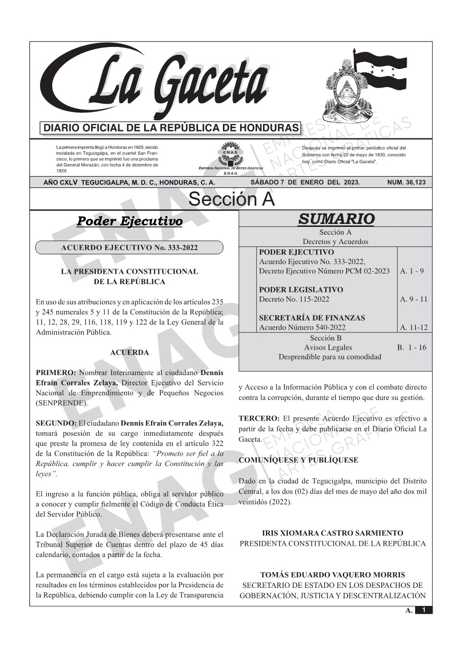 PODER EJECUTIVOAcuerdo Ejecutivo No. 333-2022, Decreto Ejecutivo Número PCM 02-2023