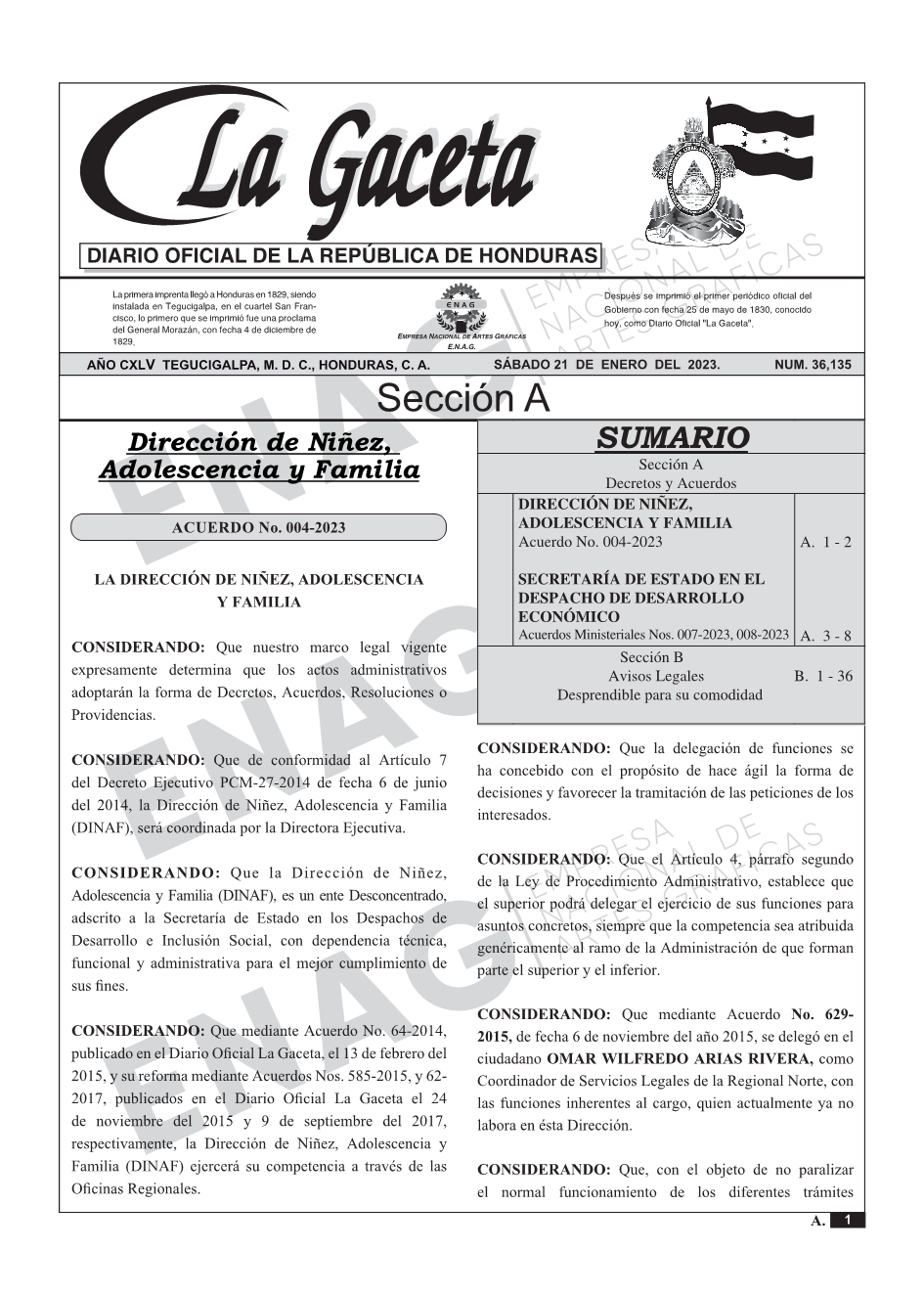 DIRECCIÓN DE NIÑEZ, ADOLESCENCIA Y FAMILIAAcuerdo No. 004-2023