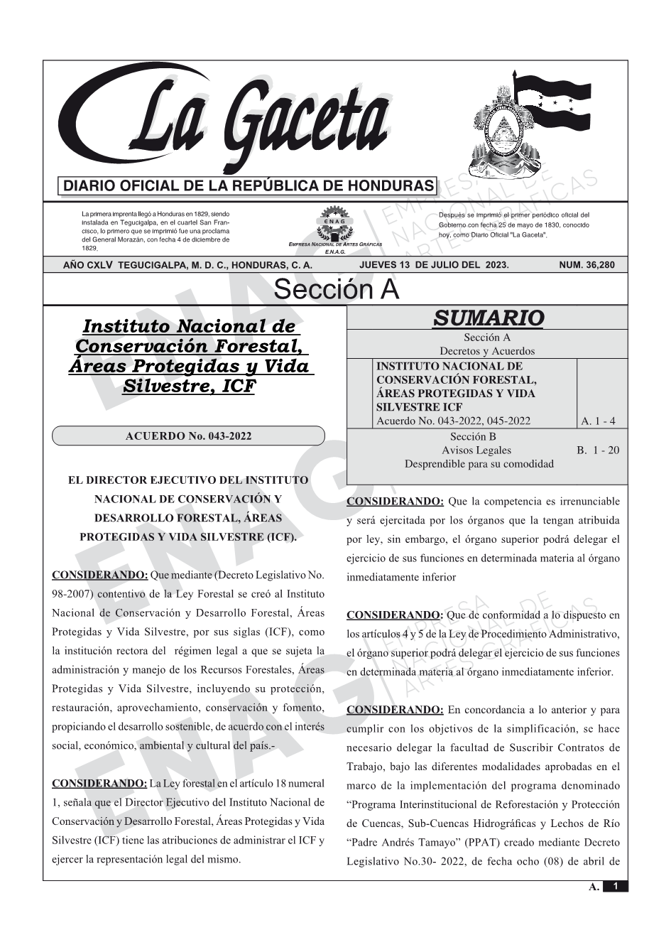 INSTITUTO NACIONAL DE CONSERVACIÓN FORESTAL, ÁREAS PROTEGIDAS Y VIDA SILVESTRE ICFAcuerdo No. 043-2022, 045-2022