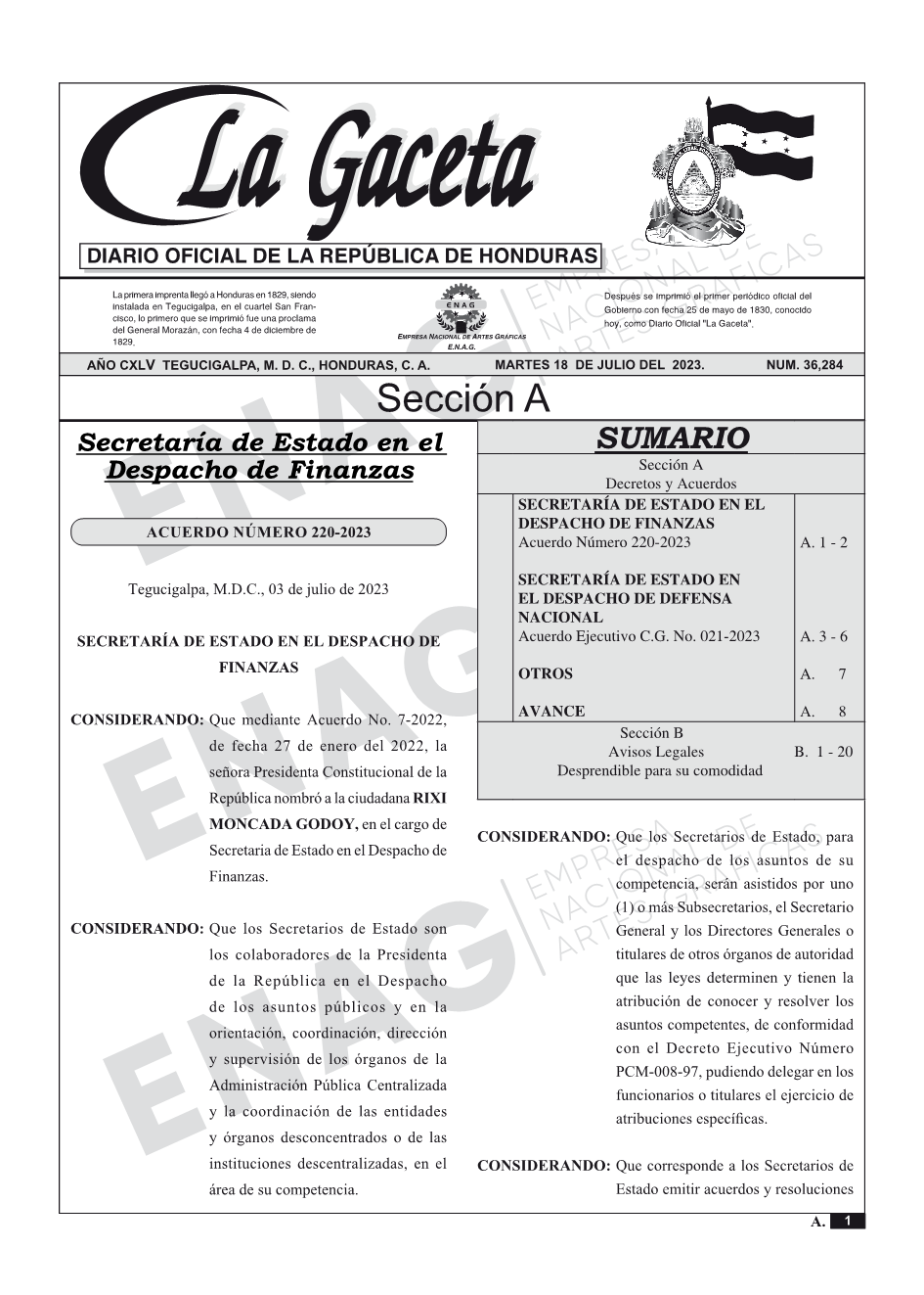 SECRETARÍA DE ESTADO EN EL DESPACHO DE FINANZASAcuerdo Número 220-2023