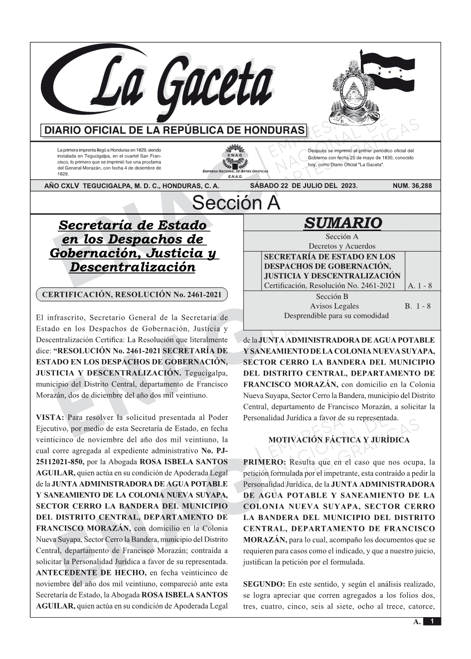 SECRETARÍA DE ESTADO EN LOS DESPACHOS DE GOBERNACIÓN, JUSTICIA Y DESCENTRALIZACIÓNCertificación, Resolución No. 2461-2021