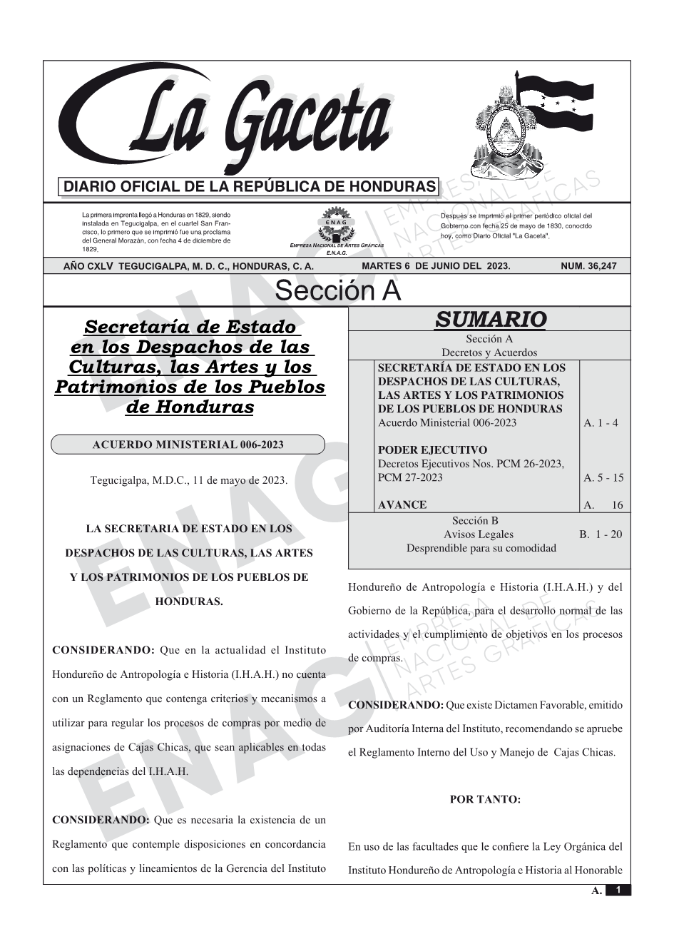 SECRETARÍA DE ESTADO EN LOS DESPACHOS DE LAS CULTURAS, LAS ARTES Y LOS PATRIMONIOS DE LOS PUEBLOS DE HONDURASAcuerdo Ministerial 006-2023
