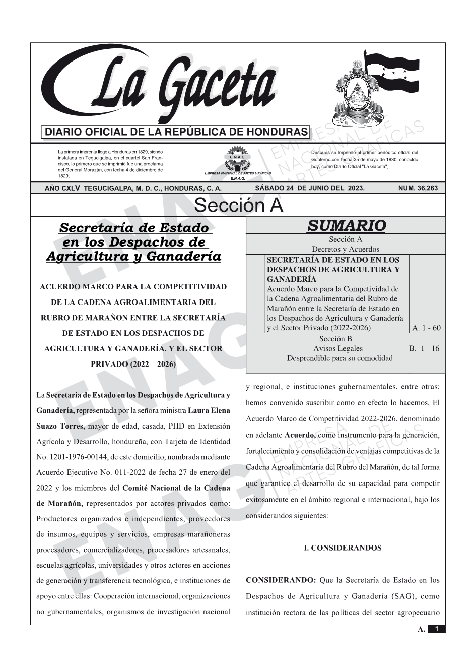 Acuerdo Marco para la Competitividad de la Cadena Agroalimentaria del Rubro de Marañón entre la Secretaría de Estado en los Despachos de Agricultura y Ganadería y el Sector Privado (2022-2026)