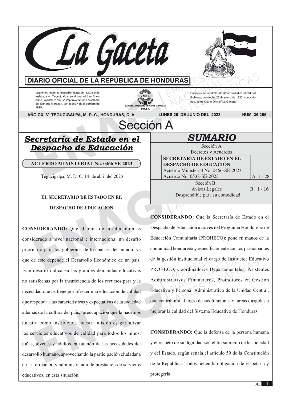 SECRETARÍA DE ESTADO EN EL DESPACHO DE EDUCACIÓNAcuerdo Ministerial No. 0466-SE-2023, Acuerdo No. 0538-SE-2023