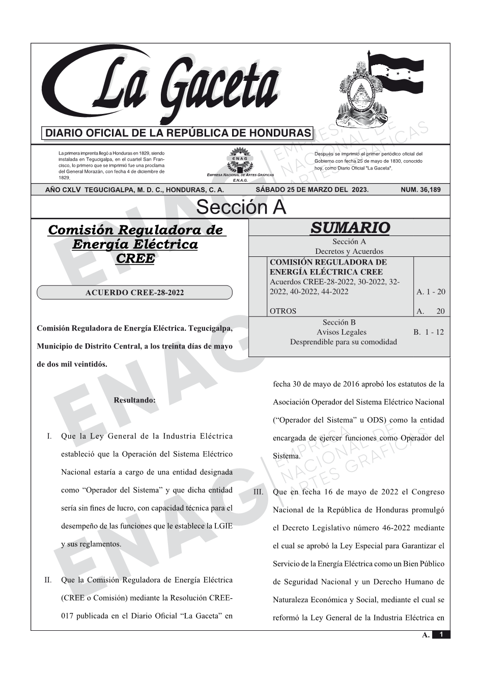COMISIÓN REGULADORA DE ENERGÍA ELÉCTRICA CREEAcuerdos CREE-28-2022, 30-2022, 322022, 40-2022, 44-2022
