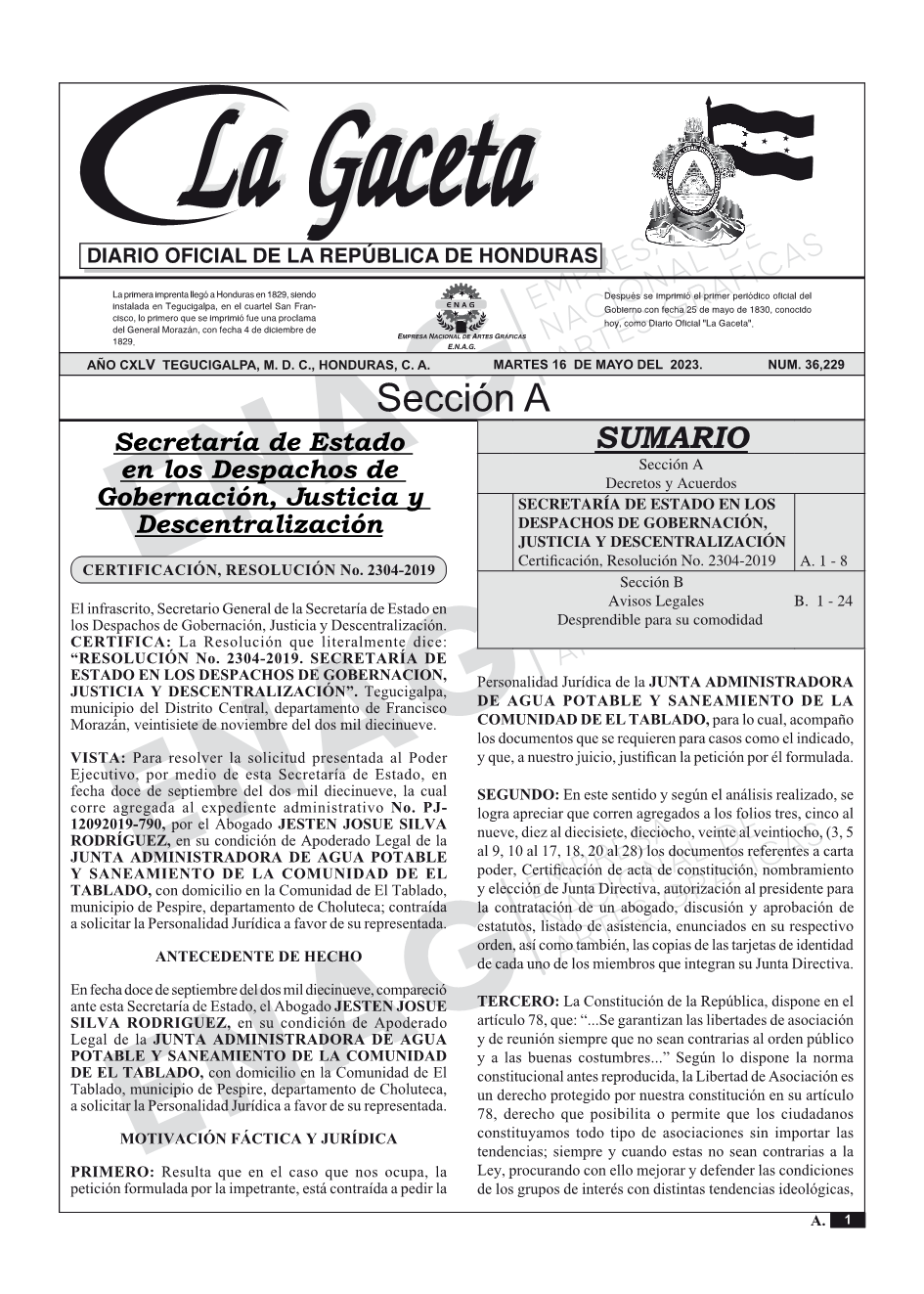 SECRETARÍA DE ESTADO EN LOS DESPACHOS DE GOBERNACIÓN, JUSTICIA Y DESCENTRALIZACIÓNCertificación, Resolución No. 2304-2019