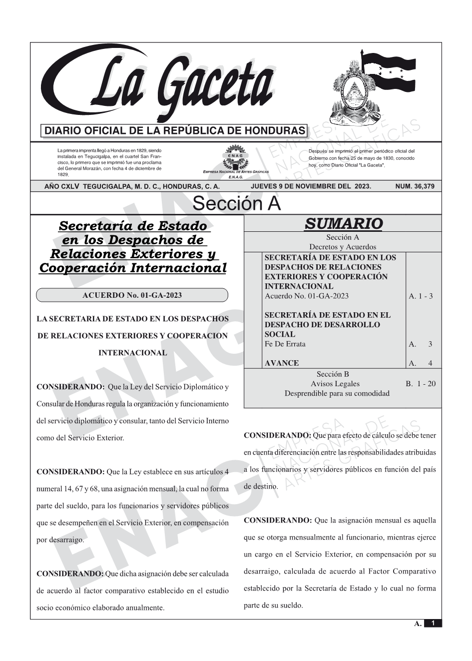 SECRETARÍA DE ESTADO EN LOS DESPACHOS DE RELACIONES EXTERIORES Y COOPERACIÓN INTERNACIONALAcuerdo No. 01-GA-2023