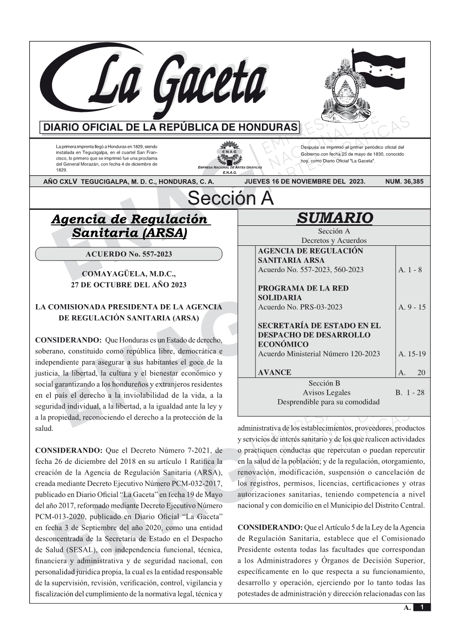 AGENCIA DE REGULACIÓN SANITARIA ARSAAcuerdo No. 557-2023, 560-2023