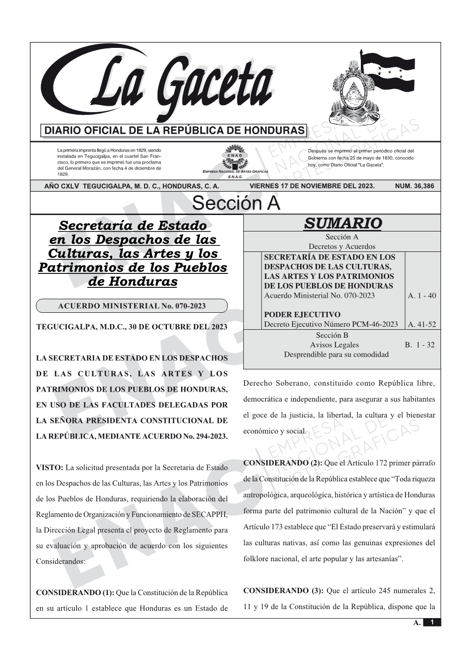 SECRETARÍA DE ESTADO EN LOS DESPACHOS DE LAS CULTURAS, LAS ARTES Y LOS PATRIMONIOS DE LOS PUEBLOS DE HONDURASAcuerdo Ministerial No. 070-2023