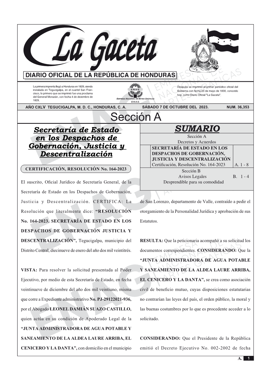 SECRETARÍA DE ESTADO EN LOS DESPACHOS DE GOBERNACIÓN, JUSTICIA Y DESCENTRALIZACIÓNCertificación, Resolución No. 164-2023