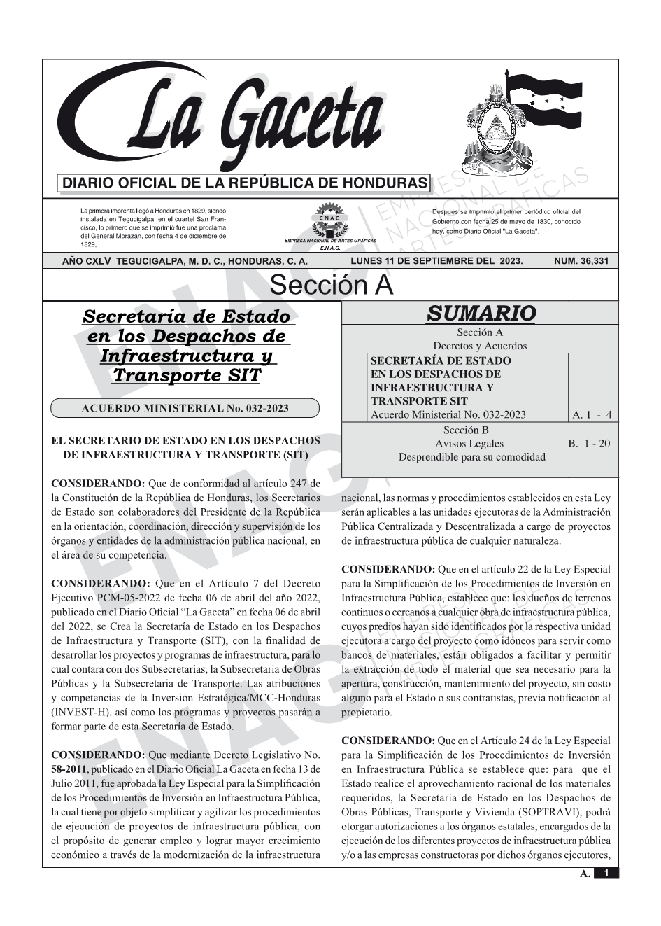 SECRETARÍA DE ESTADO EN LOS DESPACHOS DE INFRAESTRUCTURA Y TRANSPORTE SITAcuerdo Ministerial No. 032-2023