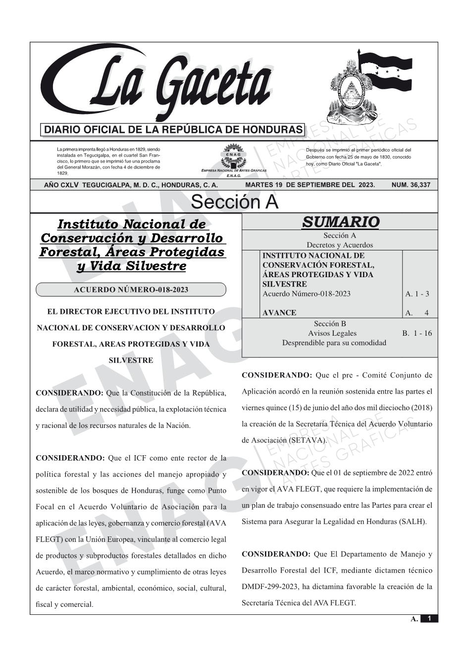 INSTITUTO NACIONAL DE CONSERVACIÓN FORESTAL, ÁREAS PROTEGIDAS Y VIDA SILVESTREAcuerdo Número-018-2023