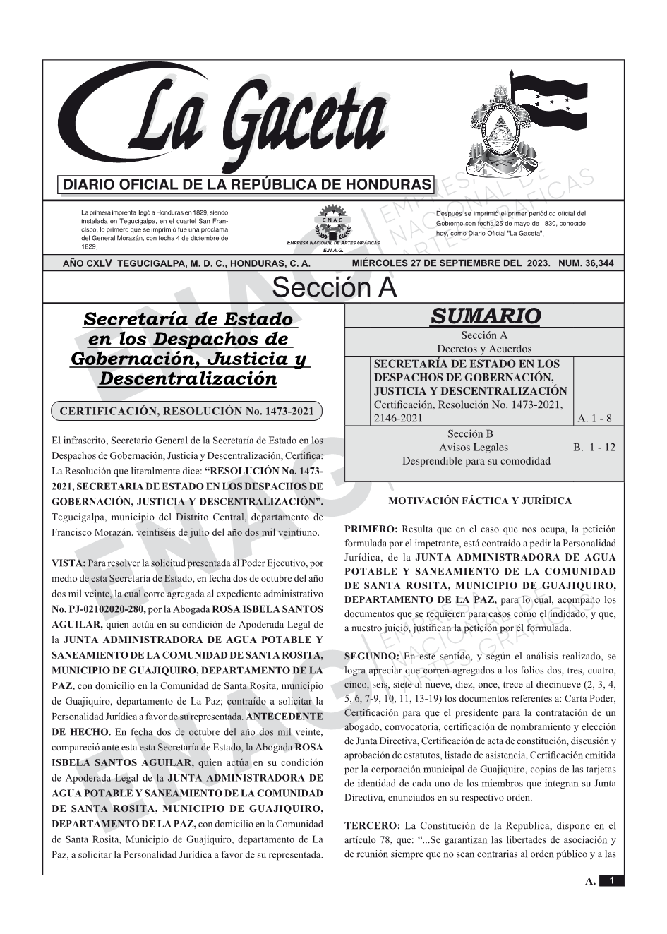 SECRETARÍA DE ESTADO EN LOS DESPACHOS DE GOBERNACIÓN, JUSTICIA Y DESCENTRALIZACIÓNCertificación, Resolución No. 1473-2021, 2146-2021