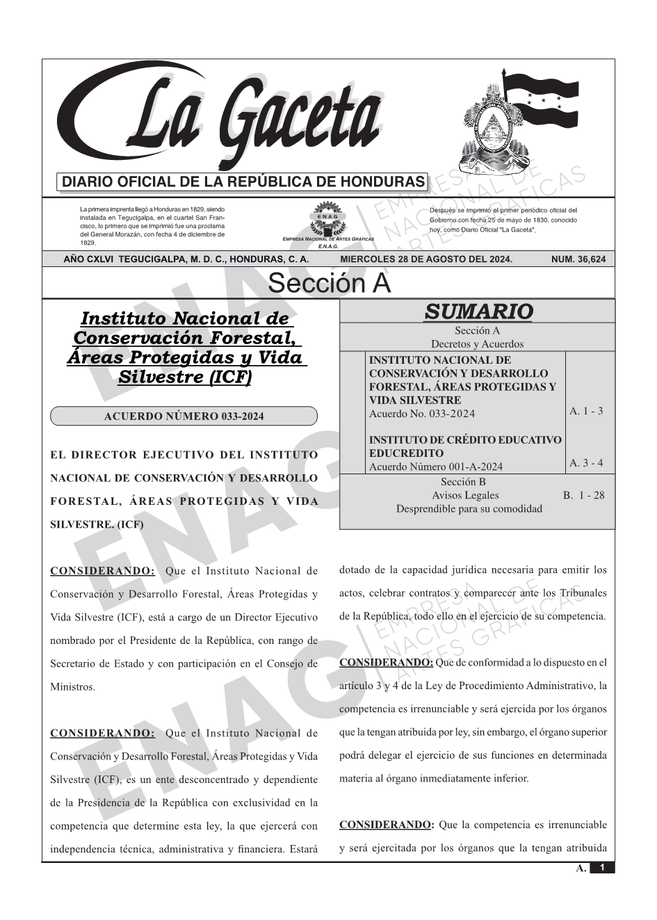 INSTITUTO NACIONAL DE CONSERVACIÓN Y DESARROLLO FORESTAL, ÁREAS PROTEGIDAS Y VIDA SILVESTREAcuerdo No. 033-2024