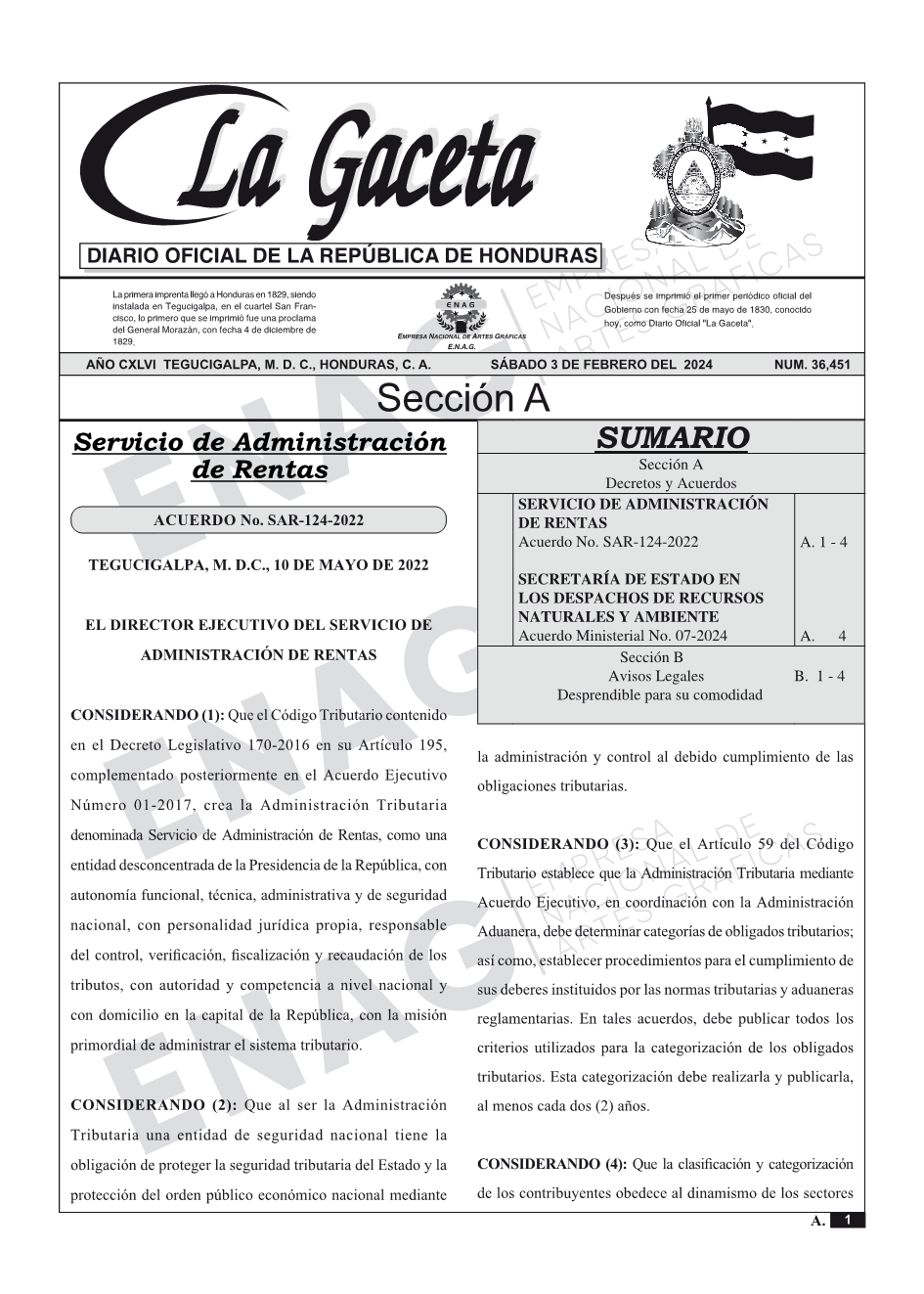 SERVICIO DE ADMINISTRACIÓN DE RENTASAcuerdo No. SAR-124-2022