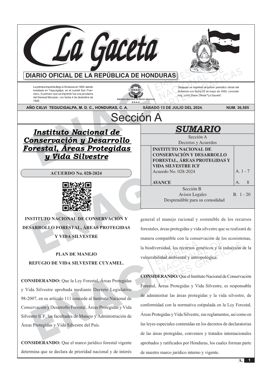 INSTITUTO NACIONAL DE CONSERVACIÓN Y DESARROLLO FORESTAL, ÁREAS PROTEGIDAS Y VIDA SILVESTRE ICFAcuerdo No. 028-2024