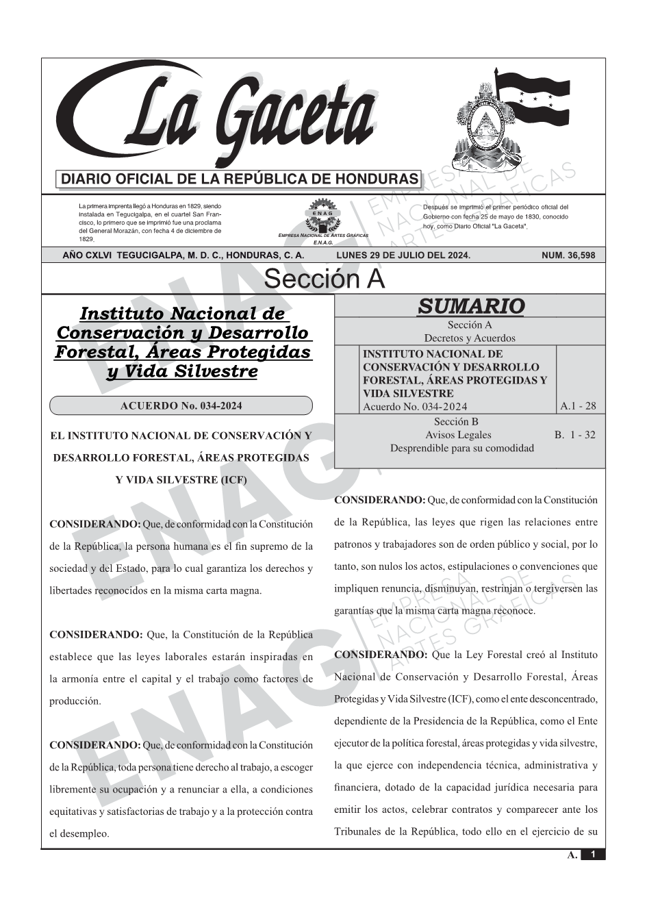 INSTITUTO NACIONAL DE CONSERVACIÓN Y DESARROLLO FORESTAL, ÁREAS PROTEGIDAS Y VIDA SILVESTREAcuerdo No. 034-2024