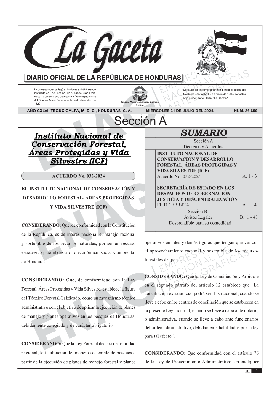 INSTITUTO NACIONAL DE CONSERVACIÓN Y DESARROLLO FORESTAL, ÁREAS PROTEGIDAS Y VIDA SILVESTRE (ICF)Acuerdo No. 032-2024