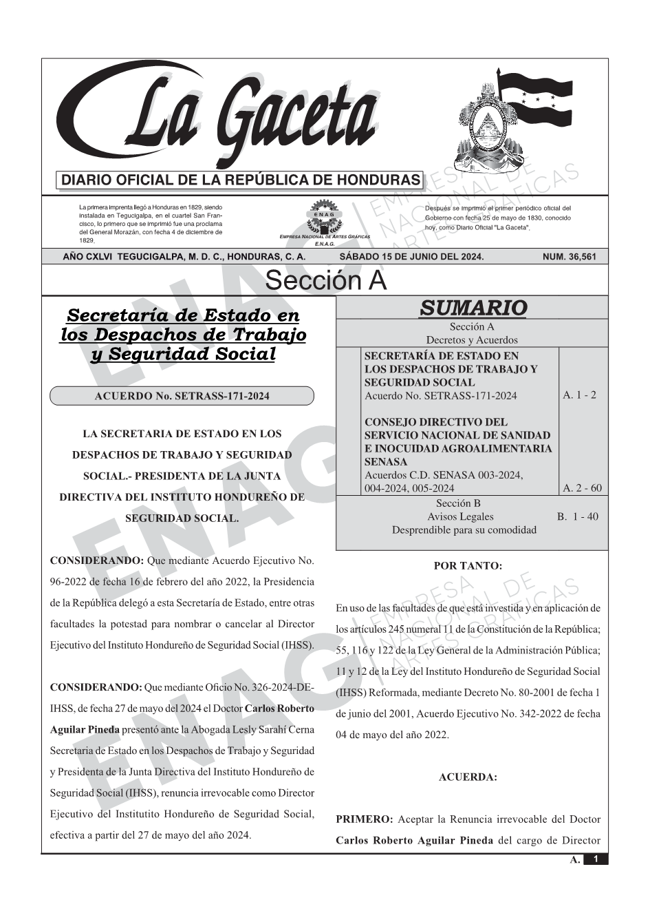SECRETARÍA DE ESTADO EN LOS DESPACHOS DE TRABAJO Y SEGURIDAD SOCIALAcuerdo No. SETRASS-171-2024