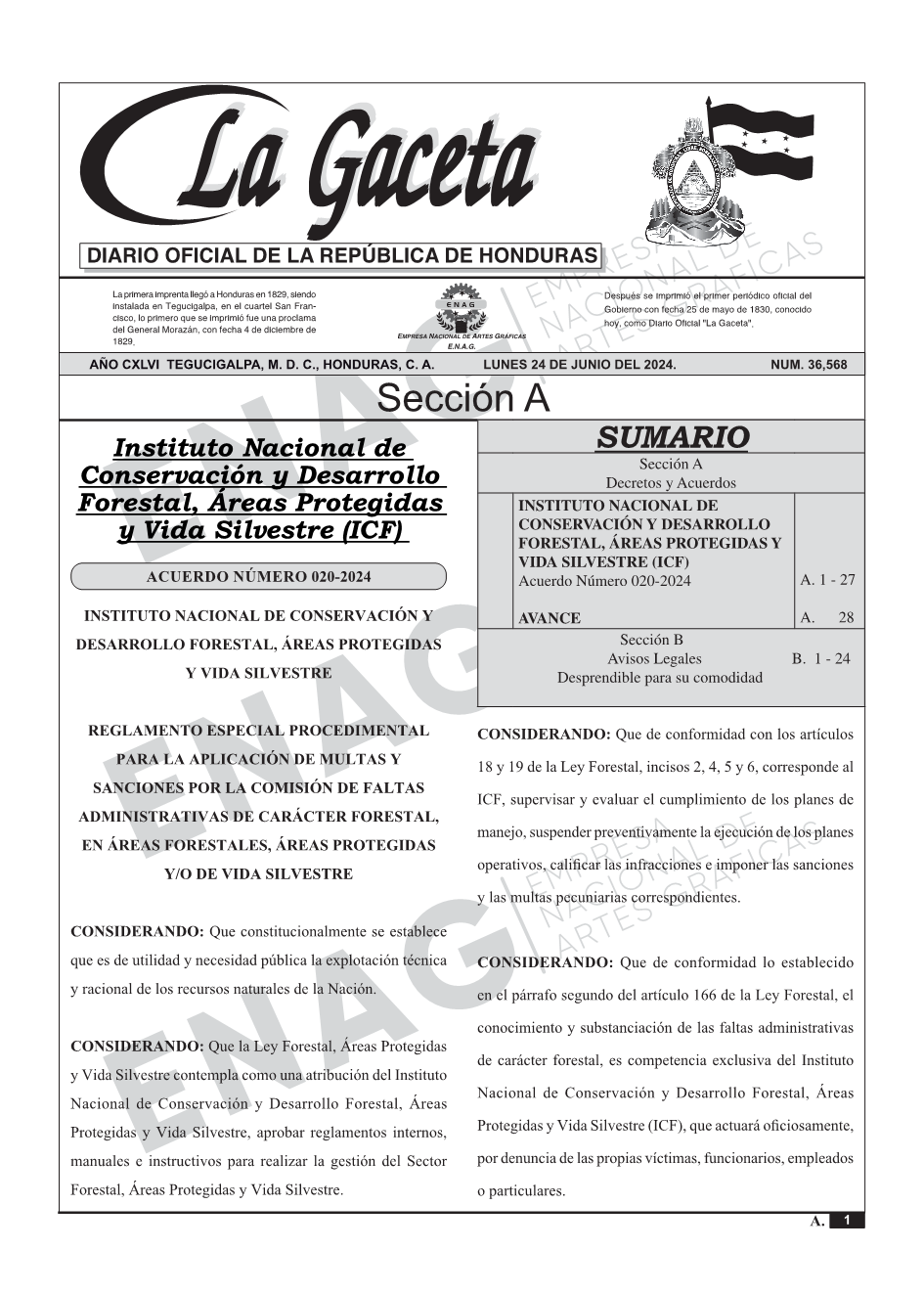 INSTITUTO NACIONAL DE CONSERVACIÓN Y DESARROLLO FORESTAL, ÁREAS PROTEGIDAS Y VIDA SILVESTRE (ICF)Acuerdo Número 020-2024