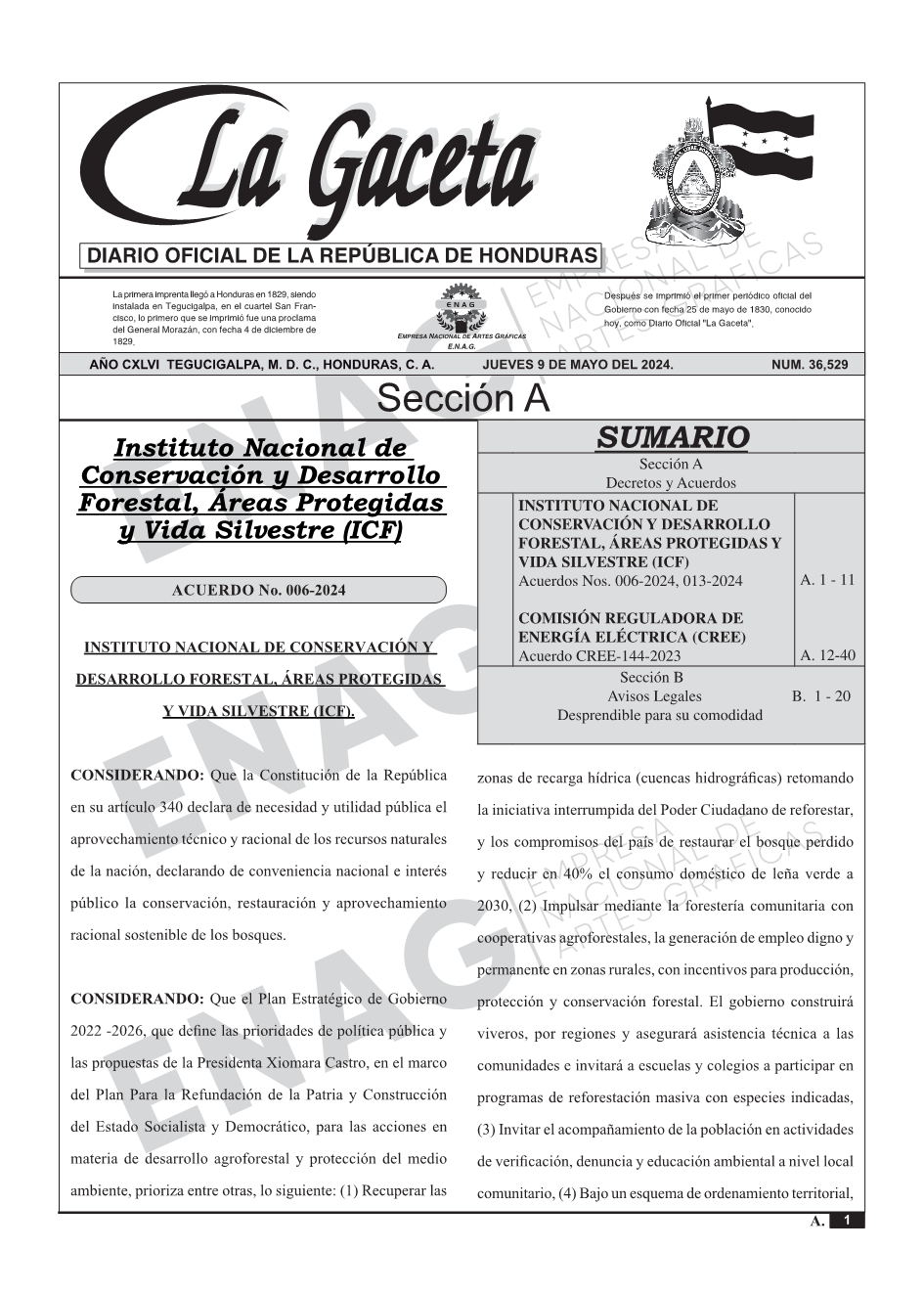 INSTITUTO NACIONAL DE CONSERVACIÓN Y DESARROLLO FORESTAL, ÁREAS PROTEGIDAS Y VIDA SILVESTRE (ICF)Acuerdos Nos. 006-2024, 013-2024