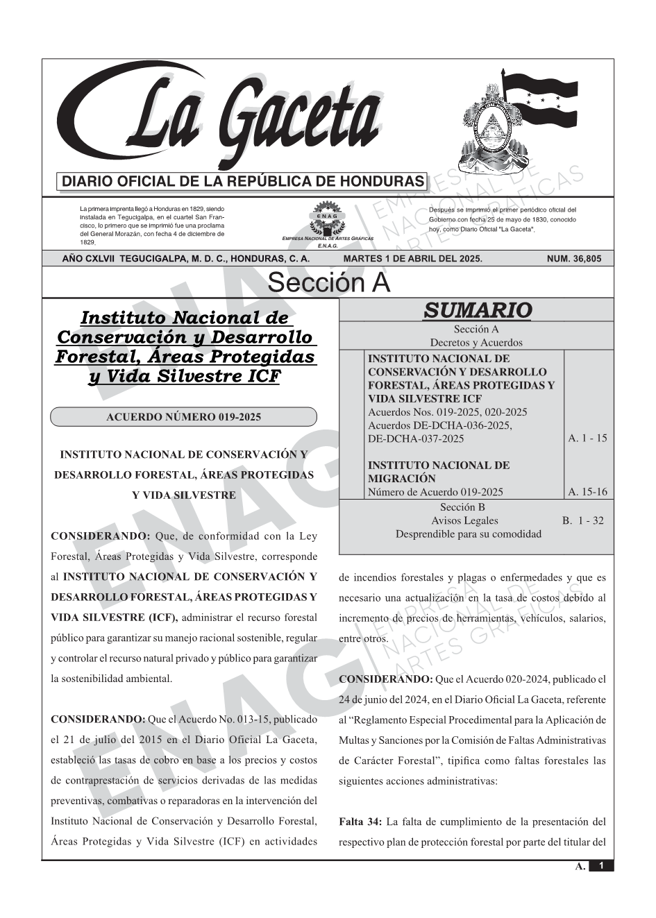 INSTITUTO NACIONAL DE CONSERVACIÓN Y DESARROLLO FORESTAL, ÁREAS PROTEGIDAS Y VIDA SILVESTRE ICFAcuerdos Nos. 019-2025, 020-2025, Acuerdos DE-DCHA-036-2025, DE-DCHA-037-2025