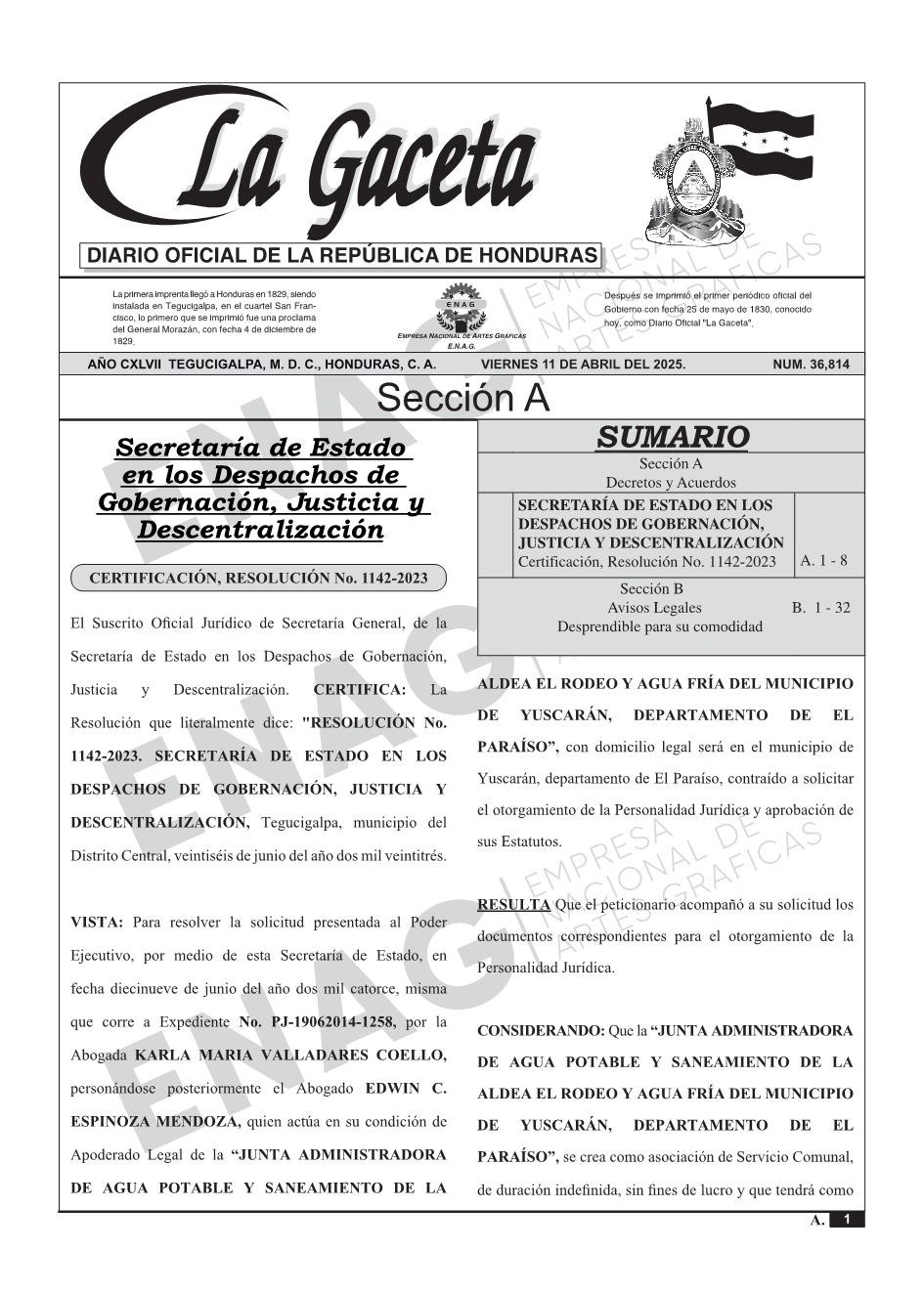 SECRETARÍA DE ESTADO EN LOS DESPACHOS DE GOBERNACIÓN, JUSTICIA Y DESCENTRALIZACIÓNCertificación, Resolución No. 1142-2023