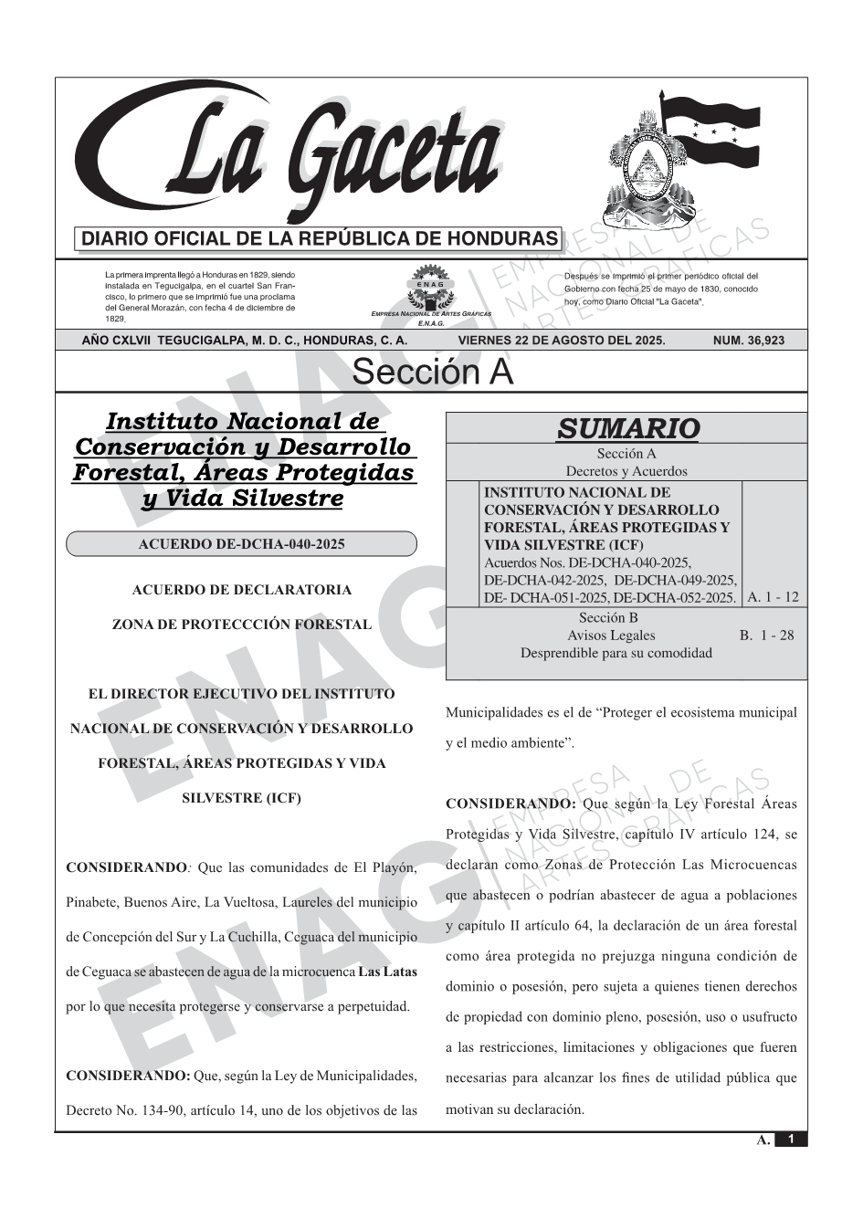 INSTITUTO NACIONAL DE CONSERVACIÓN Y DESARROLLO FORESTAL, ÁREAS PROTEGIDAS Y VIDA SILVESTRE (ICF)Acuerdos Nos. DE-DCHA-040-2025, DE-DCHA-042-2025, DE-DCHA-049-2025, DE- DCHA-051-2025, DE-DCHA-052-2025