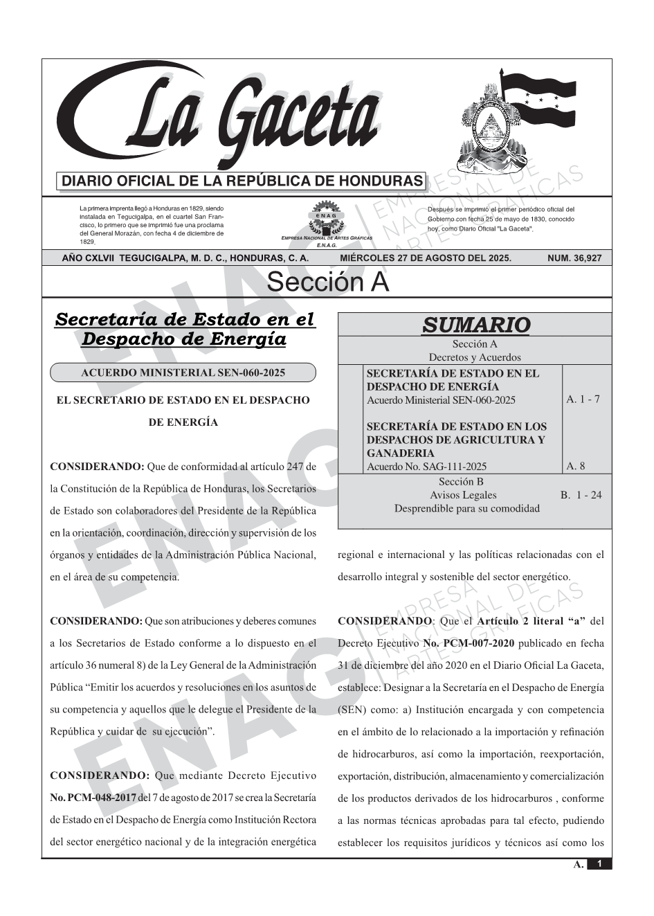 SECRETARÍA DE ESTADO EN EL DESPACHO DE ENERGÍAAcuerdo Ministerial SEN-060-2025