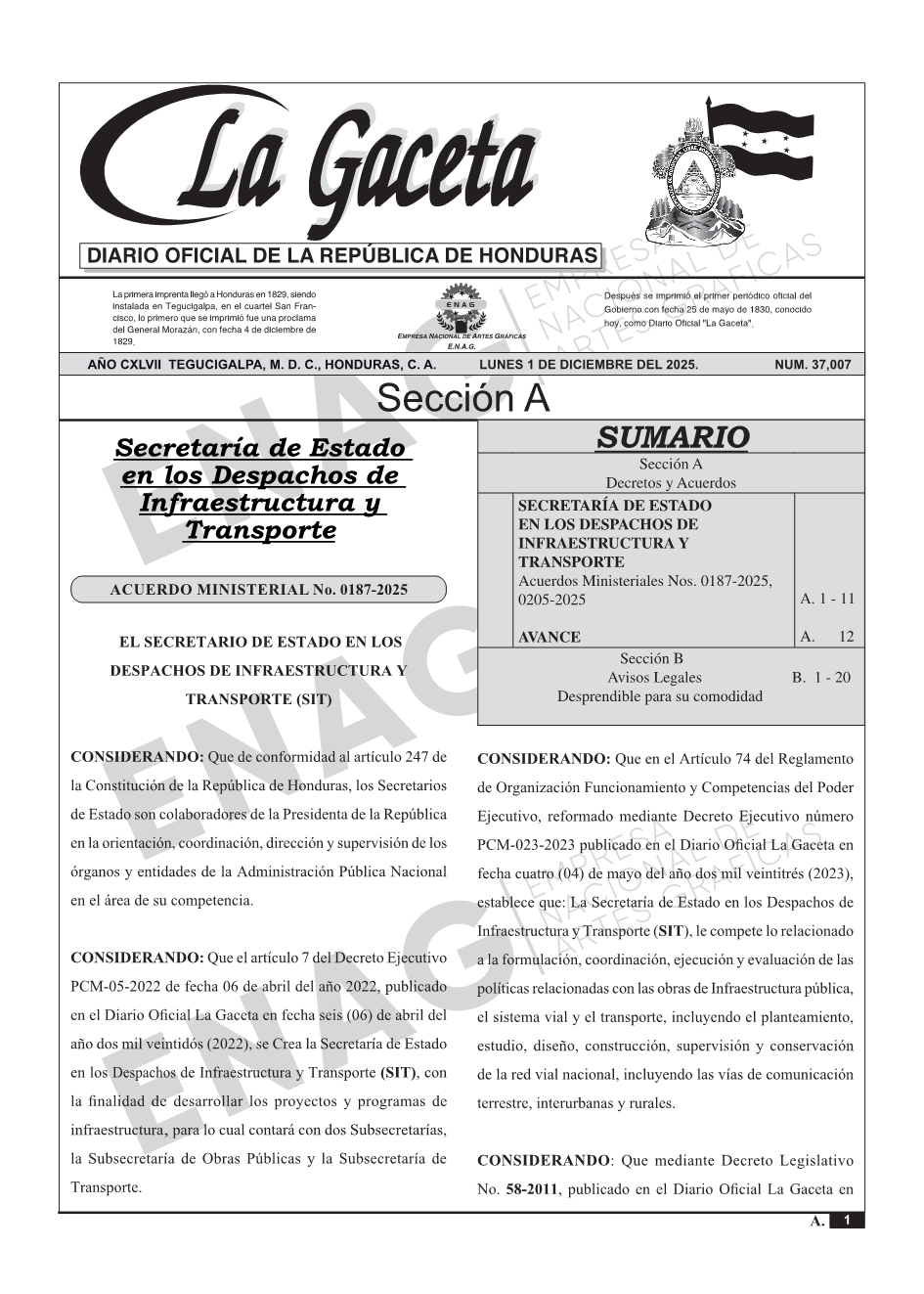 SECRETARÍA DE ESTADO EN LOS DESPACHOS DE INFRAESTRUCTURA Y TRANSPORTEAcuerdos Ministeriales Nos. 0187-2025, 0205-2025