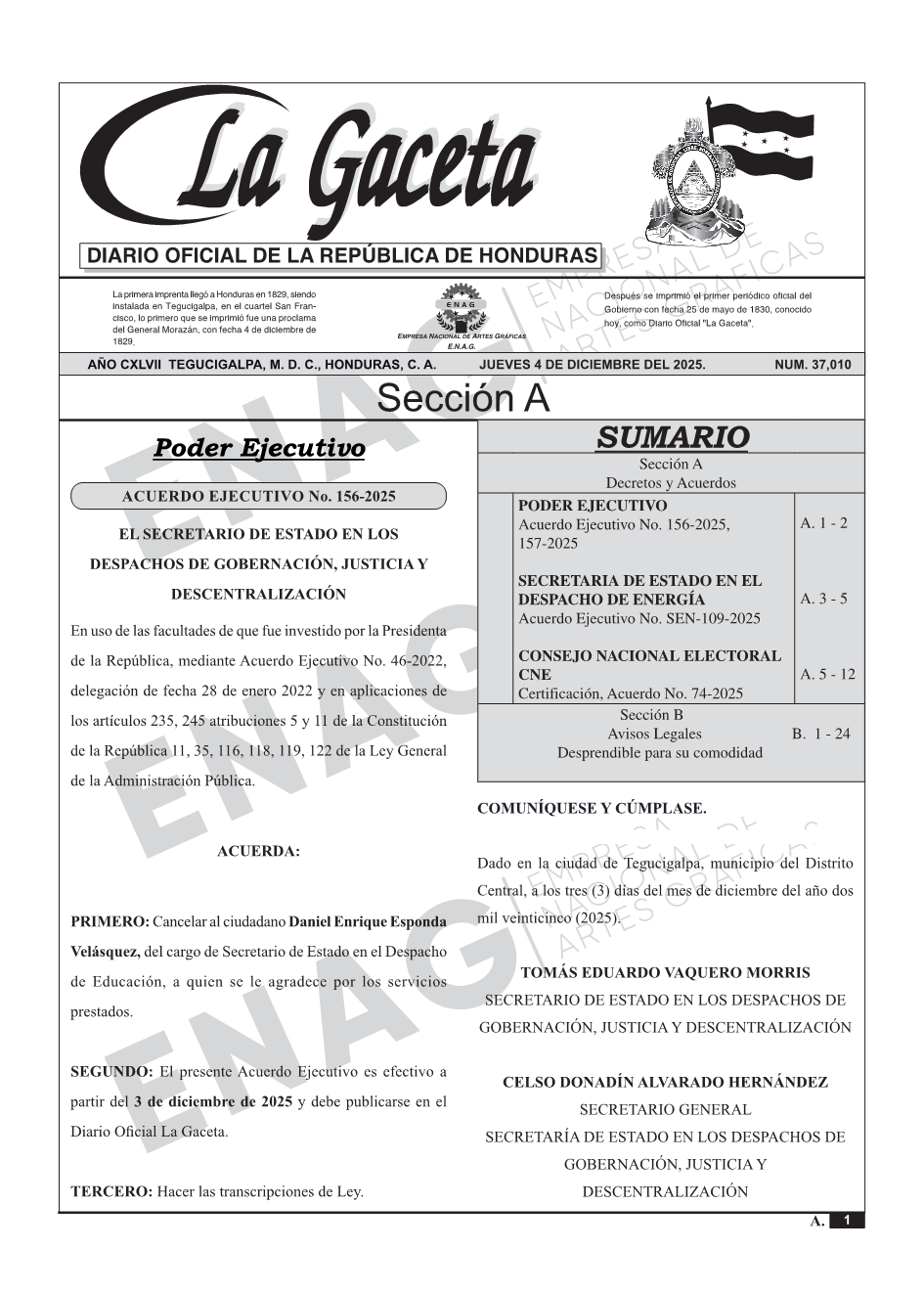 PODER EJECUTIVOAcuerdo Ejecutivo No. 156-2025, 157-2025