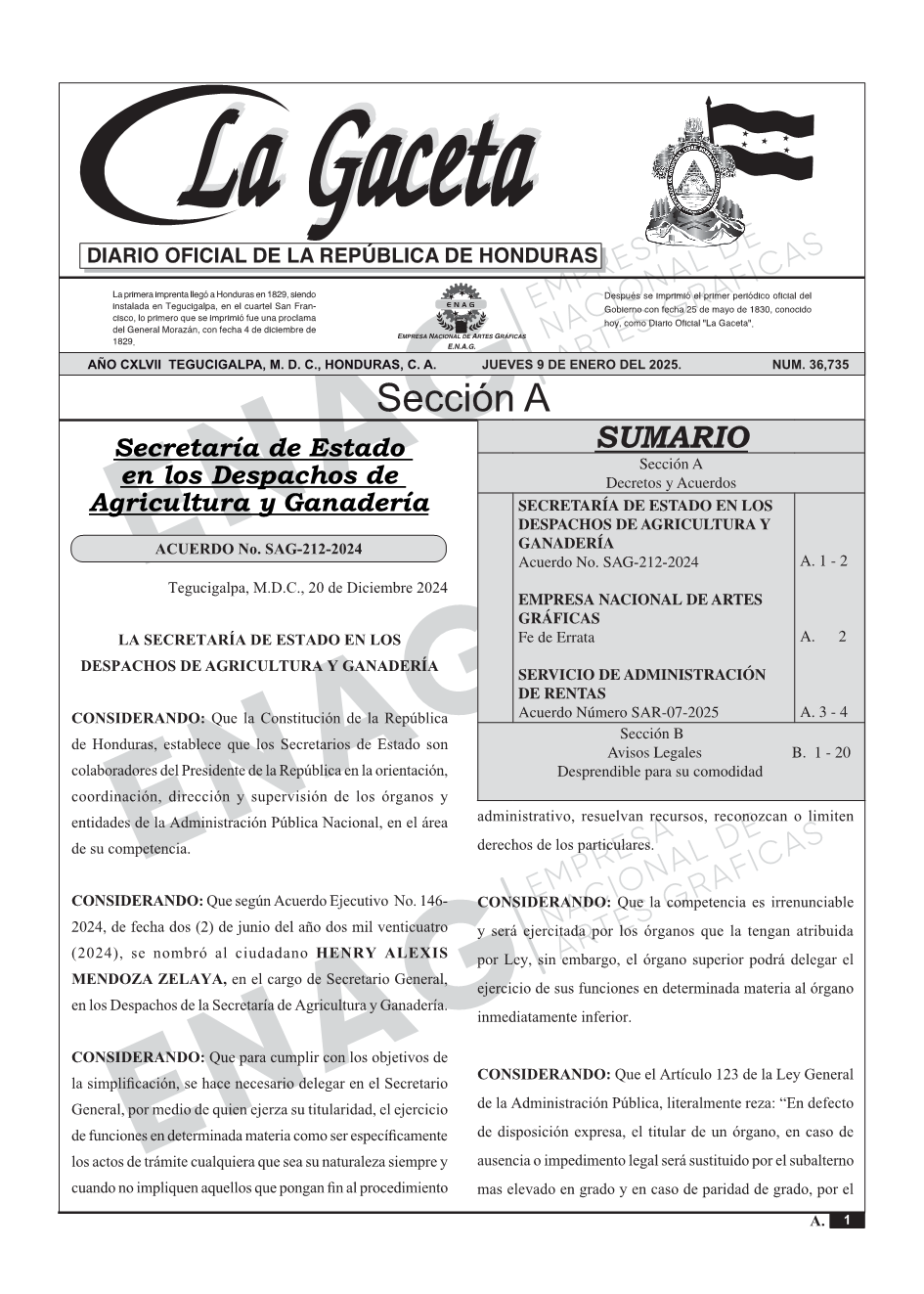 SECRETARÍA DE ESTADO EN LOS DESPACHOS DE AGRICULTURA Y GANADERÍAAcuerdo No. SAG-212-2024
