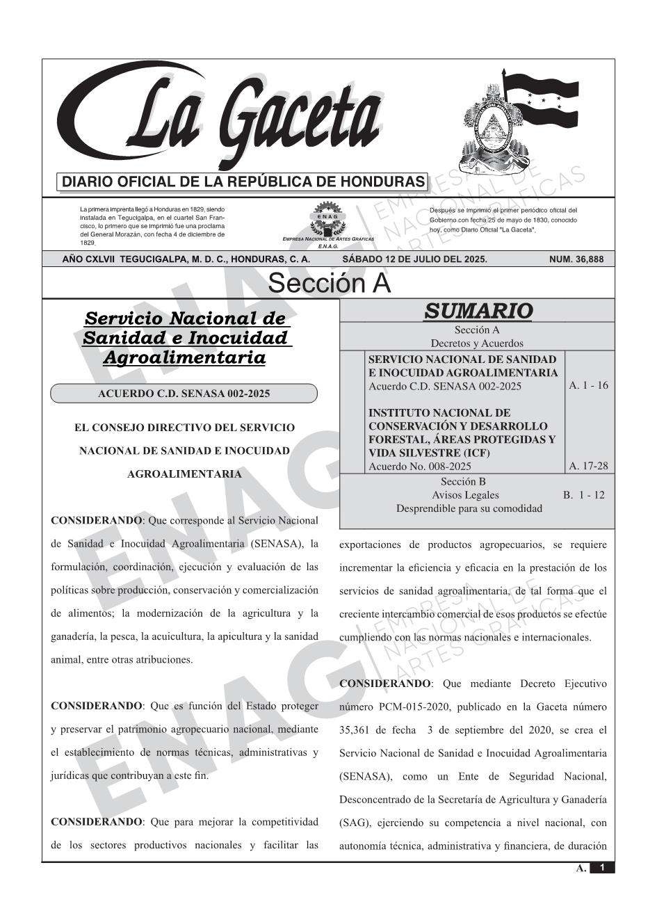 SERVICIO NACIONAL DE SANIDAD E INOCUIDAD AGROALIMENTARIAAcuerdo C.D. SENASA 002-2025