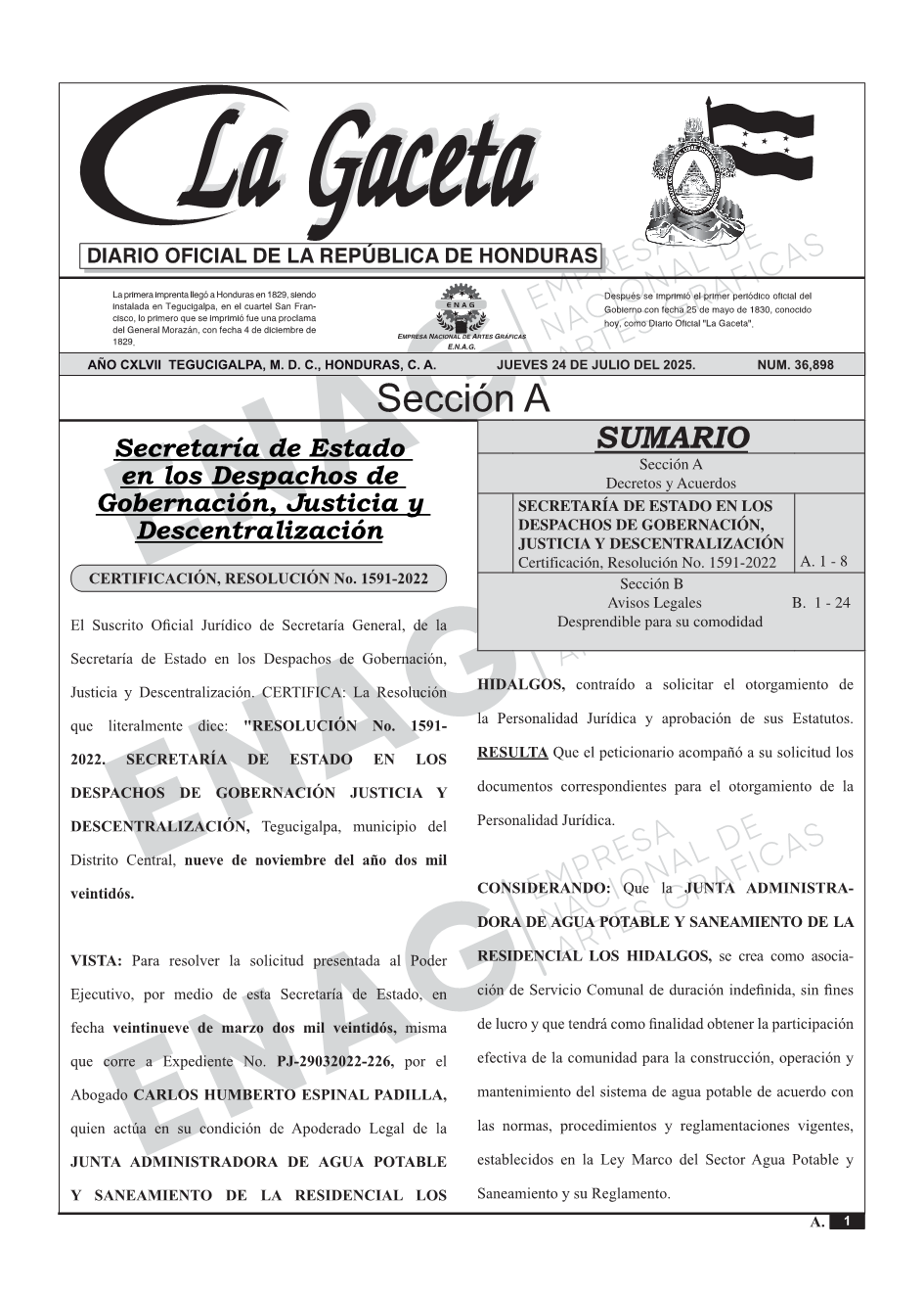 SECRETARÍA DE ESTADO EN LOS DESPACHOS DE GOBERNACIÓN, JUSTICIA Y DESCENTRALIZACIÓNCertificación, Resolución No. 1591-2022
