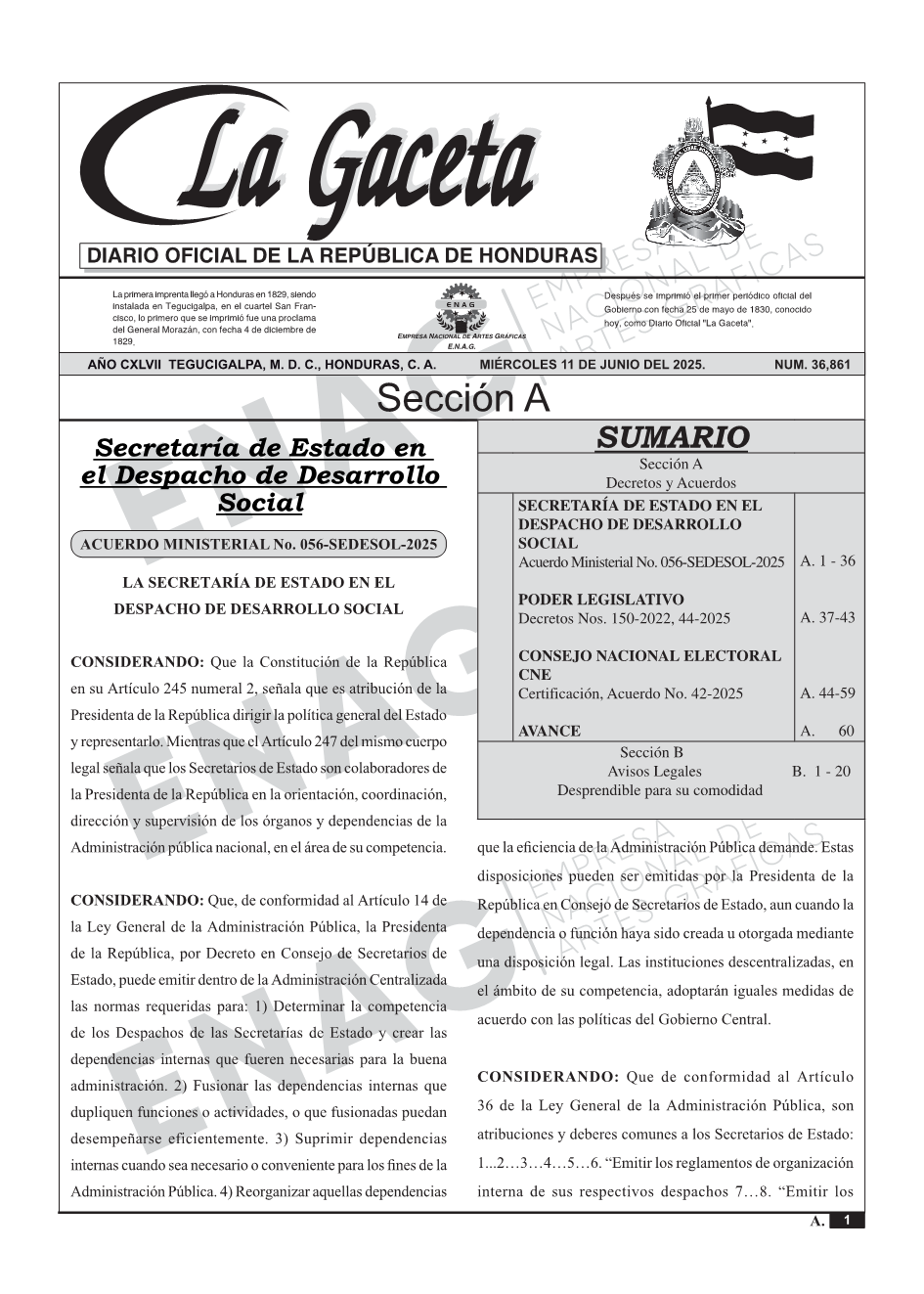 SECRETARÍA DE ESTADO EN EL DESPACHO DE DESARROLLO SOCIALAcuerdo Ministerial No. 056-SEDESOL-2025