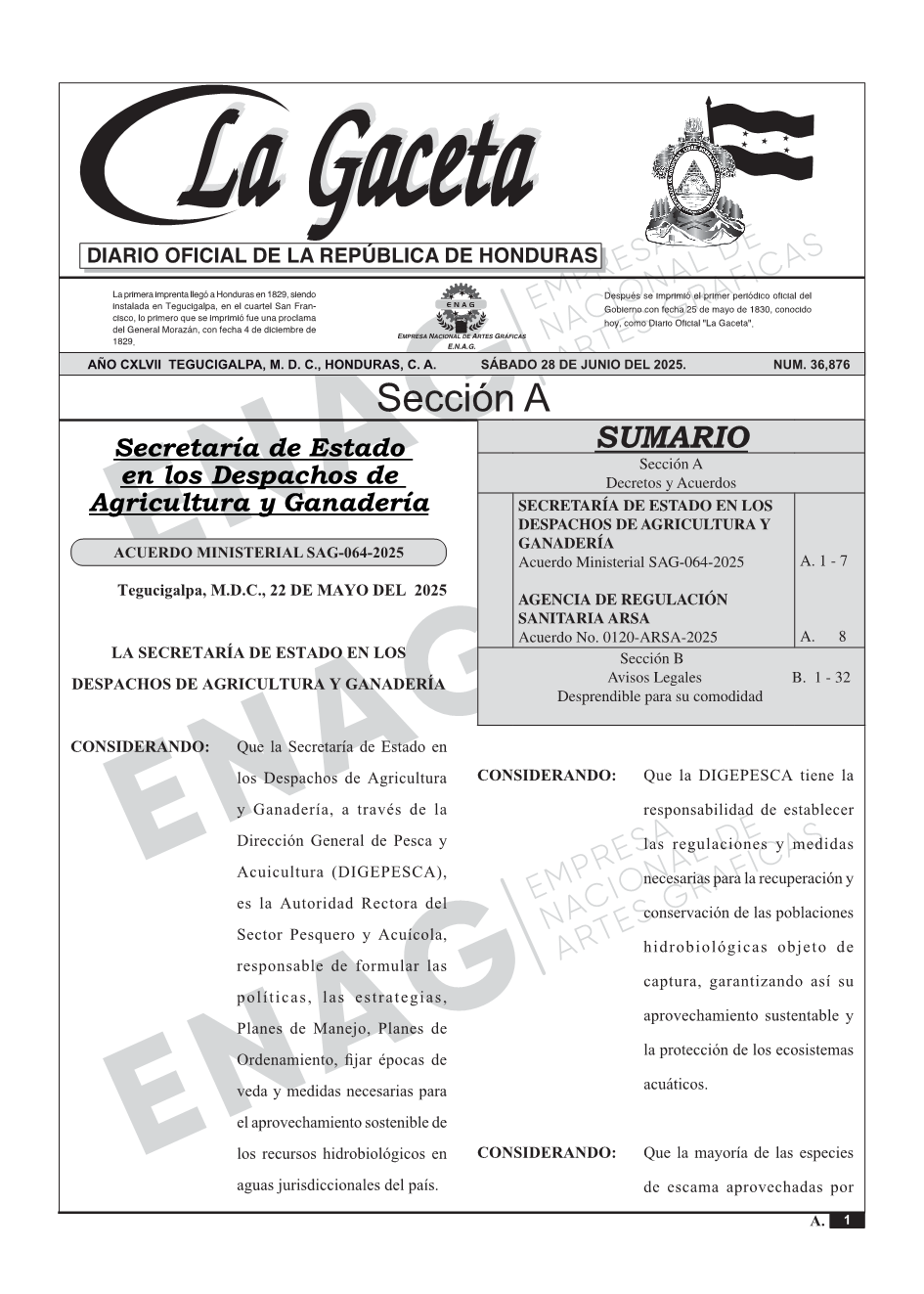 SECRETARÍA DE ESTADO EN LOS DESPACHOS DE AGRICULTURA Y GANADERÍAAcuerdo Ministerial SAG-064-2025