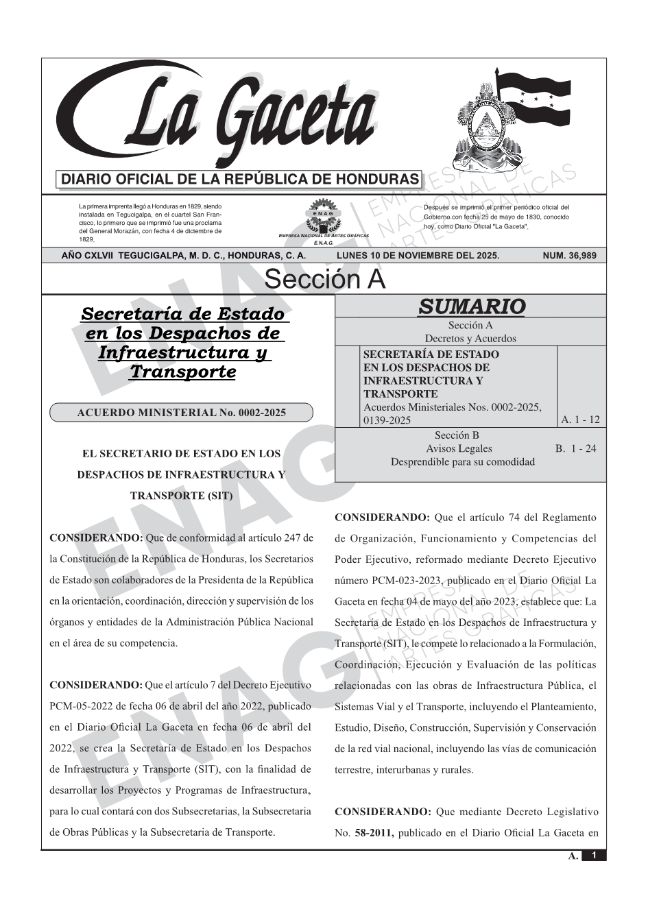 SECRETARÍA DE ESTADO EN LOS DESPACHOS DE INFRAESTRUCTURA Y TRANSPORTEAcuerdos Ministeriales Nos. 0002-2025, 0139-2025