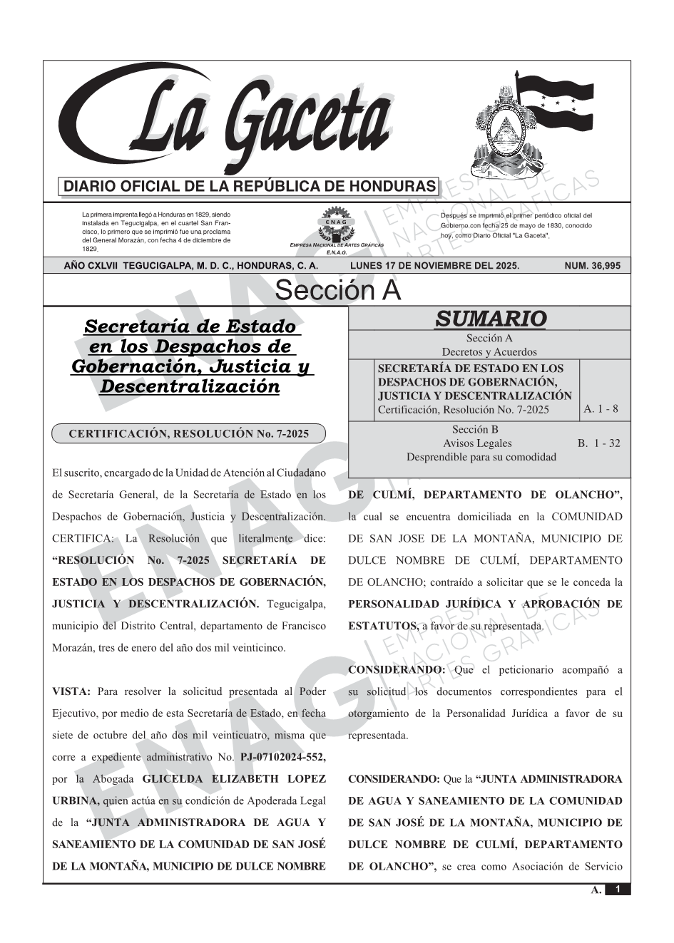 SECRETARÍA DE ESTADO EN LOS DESPACHOS DE GOBERNACIÓN, JUSTICIA Y DESCENTRALIZACIÓNCertificación, Resolución No. 7-2025