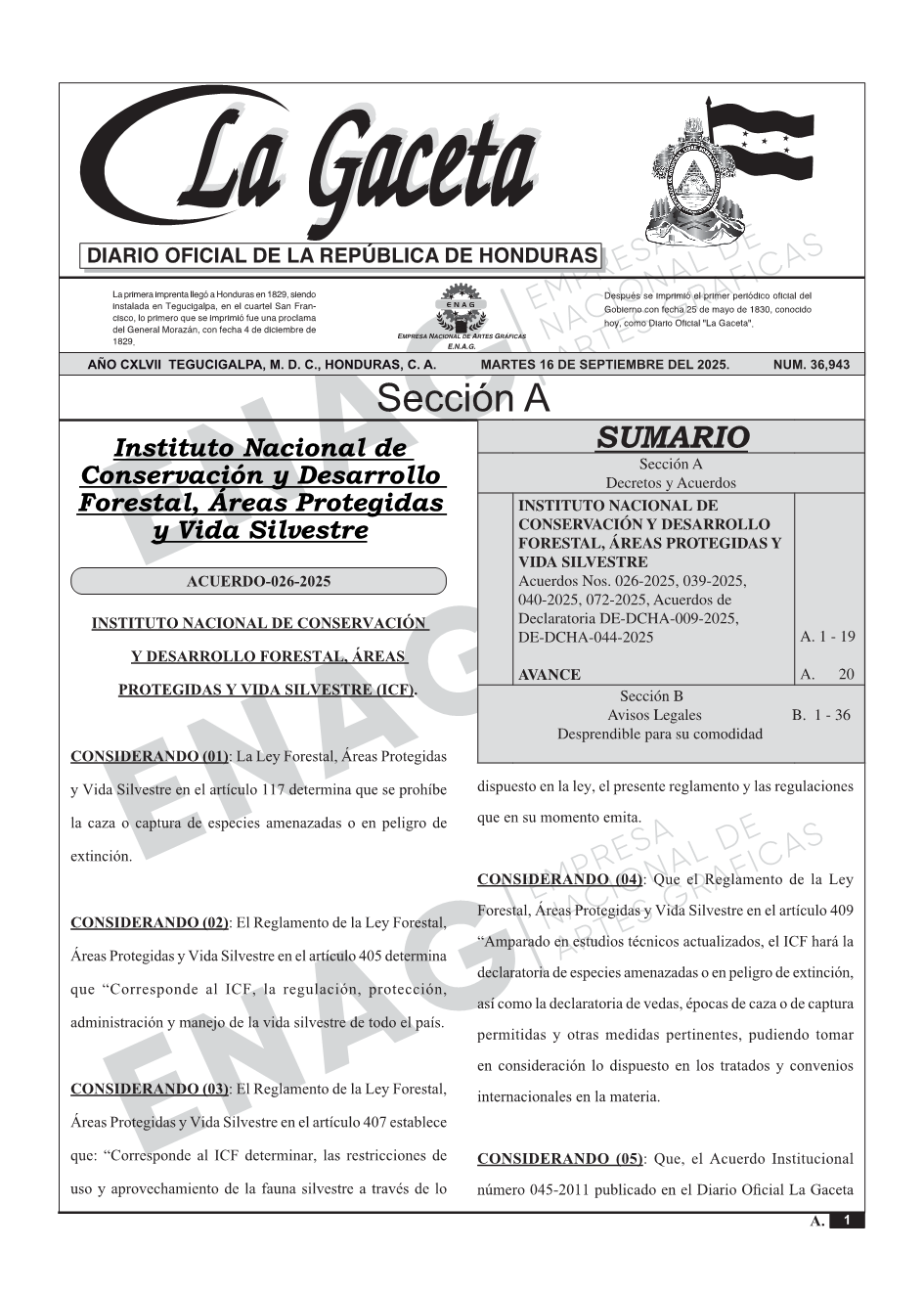 INSTITUTO NACIONAL DE CONSERVACIÓN Y DESARROLLO FORESTAL, ÁREAS PROTEGIDAS Y VIDA SILVESTREAcuerdos Nos. 026-2025, 039-2025, 040-2025, 072-2025, Acuerdos de Declaratoria DE-DCHA-009-2025, DE-DCHA-044-2025